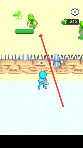 2、遇绿色敌人,控制持武器火柴人如蓝色枪手射击,优先打靠近沙包的敌人,没子弹时,让近战角色顶前。