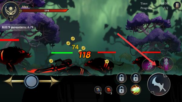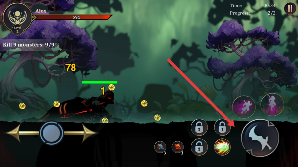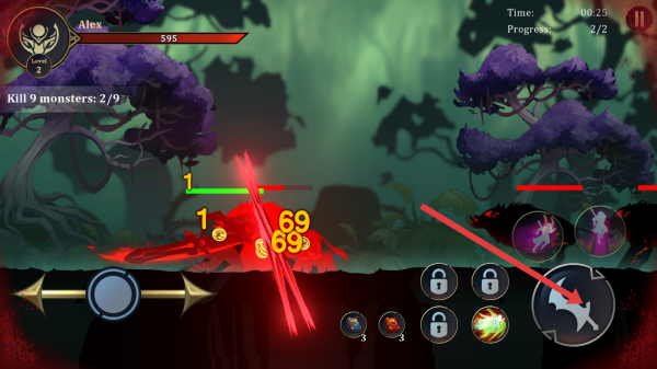 2、砍死怪物后掉金币别漏捡,攒够开技能右侧紫色图标,被围时放技能清场,需要留意血量上方的红条。