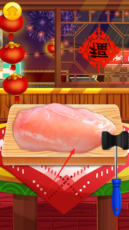 1、点击肉和锤子开始捶打鸡肉,通过反复敲击让鸡肉质地改变,为后续烹饪做准备,体验食材预处理机制。