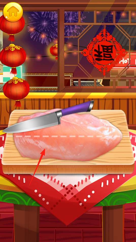 2、使用刀具沿虚线切割鸡肉,将整块肉分成合适大小,满足烹饪需求学习切割技巧,体验食材分割玩法。