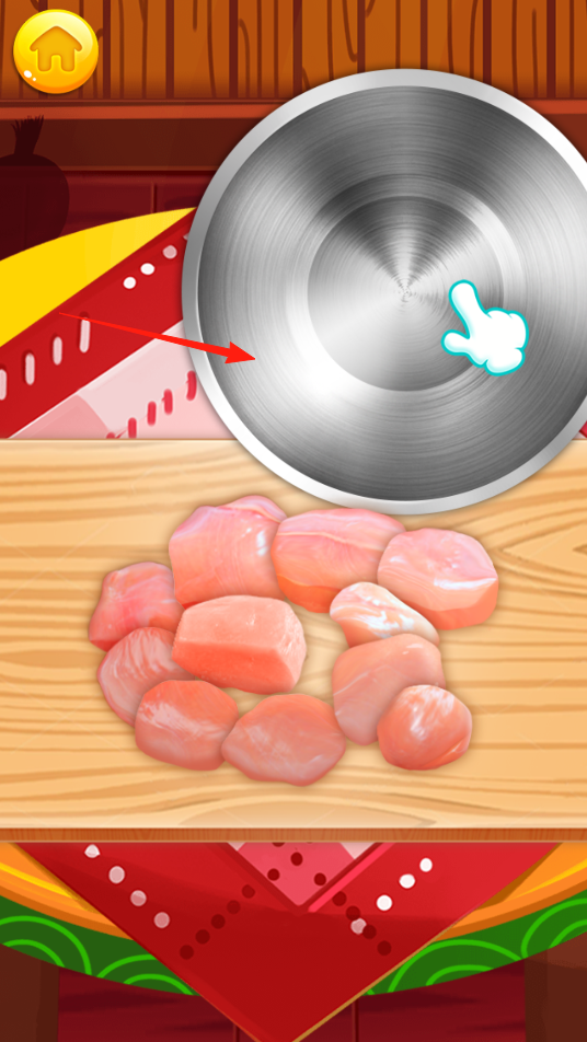 3、拖动鸡肉块放入上方的锅中,完成食材投放,开启烹饪流程,将预处理的鸡肉制作成菜肴,体验烹饪启动机制。