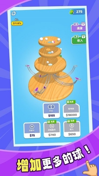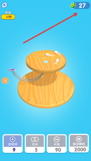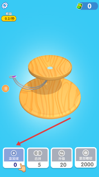 1、点击初始界面点击开始,进入游戏,解锁下方添加球,合并等功能,启动资源积累玩法。