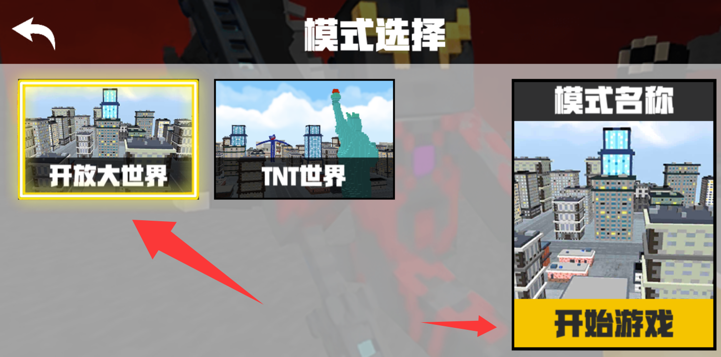2、进去游戏点击红色箭头的开发大世界再点击开始游戏。