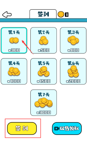 1、点击红框第1天签到按钮,领取300金币奖励。