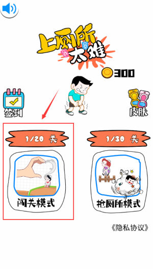 2、选择红框闯关模式,开始1/20关厕所解谜挑战。