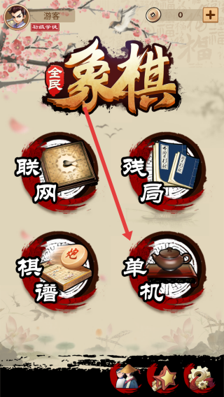 1、在全民象棋主界面中,按照指示点击单机按钮,进入单机模式选择页面开启单人象棋对战。