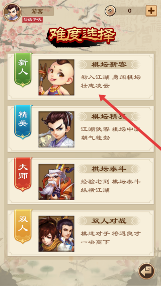 2、在难度选择界面,可以点击选择棋坛新客,以新人难度开启棋局,体验初入江湖的象棋对战。