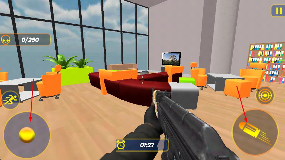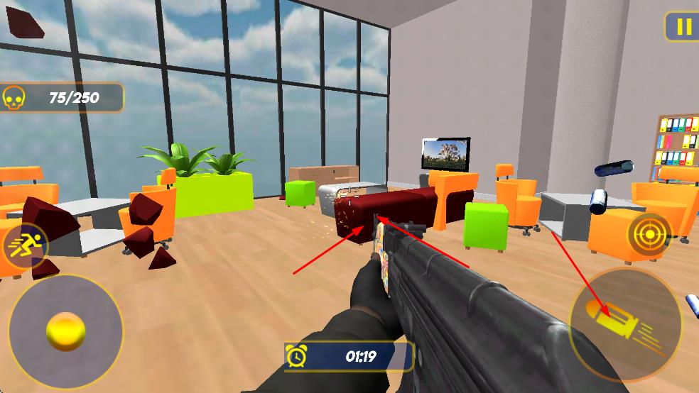1、在室内场景中,操控角色手持枪械进行射击,目标是摧毁场景内的各种物品,如沙发、椅子、桌子等。