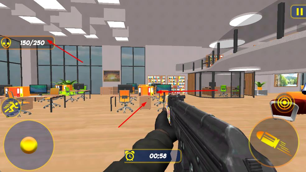 2、通过点击屏幕上的虚拟摇杆控制角色移动,点击射击按钮进行射击,每摧毁一个物品会获得相应的分数。