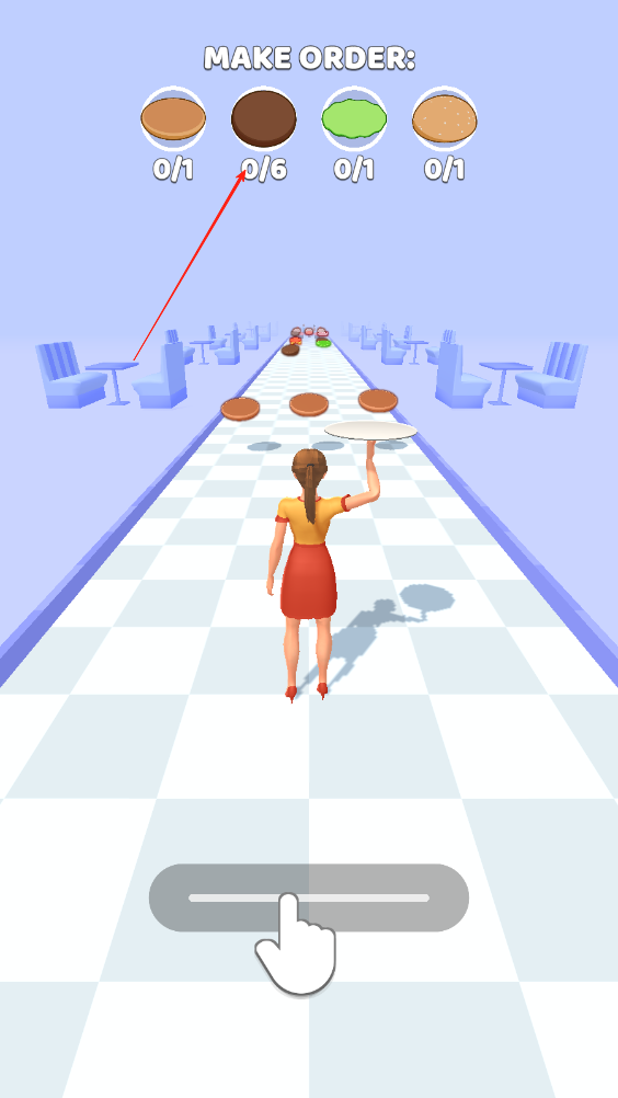 1、小姐姐举着盘子,注意观察头顶顾客的要求,食材,数量等,往前走左右移动即可收集。