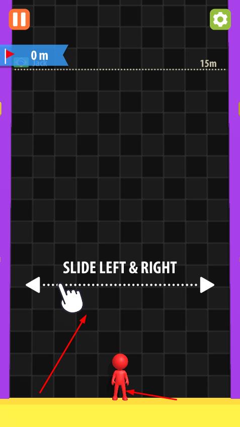 2、通过左右滑动屏幕,控制红色小人在水平方向移动,躲避掉落的方块。