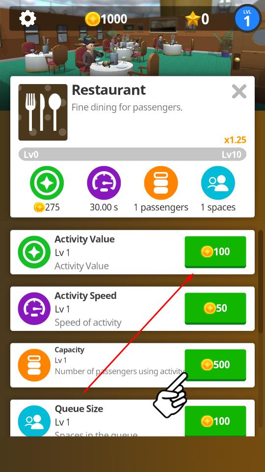 3、在餐厅界面,可消耗金币升级,如点击绿色按钮用金币提升Activity Value、Activity Speed等属性,优化餐厅运营,助力游轮经营。