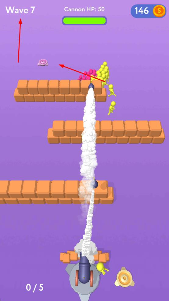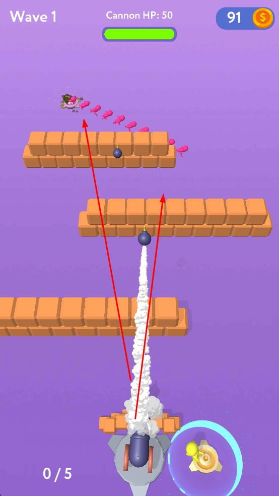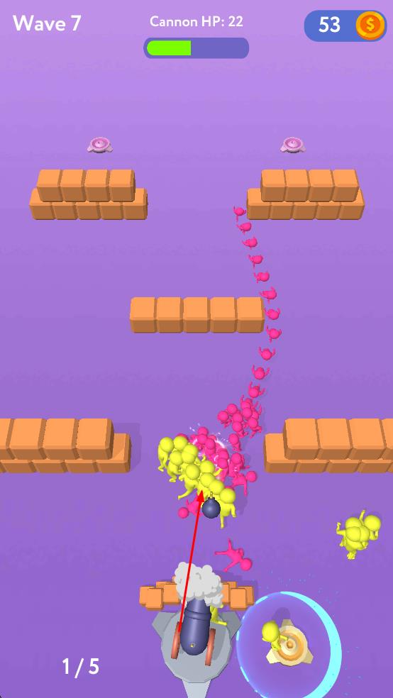 1、在不同的波次中,操控大炮发射炸弹,攻击黄色和粉色的小人角色。