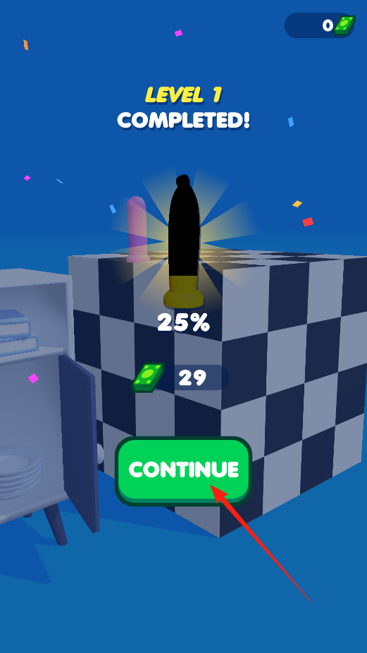 3、关卡完成后,点击CONTINUE进入结算界面,查看奖励,接着开启下一关,持续推进游戏进程,体验关卡衔接机制。