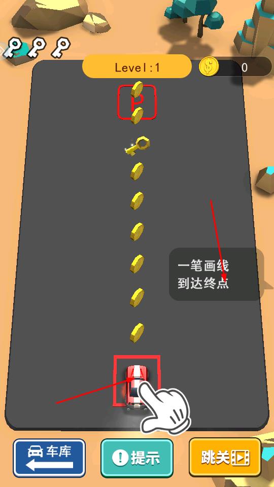 2、按一笔画线到达终点提示,从汽车位置画线连向P停车点,收集金币与钥匙,完成核心操作。