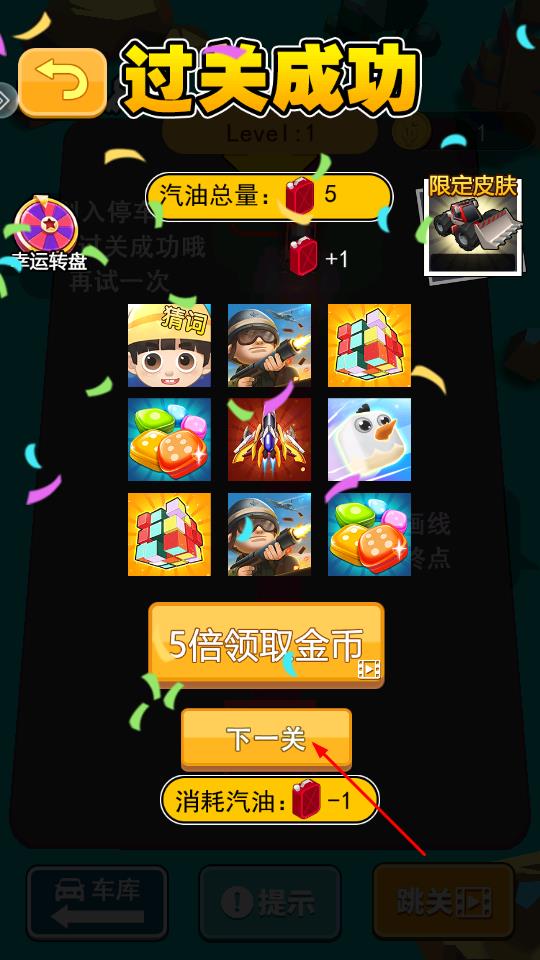 3、过关成功后,可选择5倍领取金币或直接点下一关,持续消耗汽油能够去推进游戏进程。