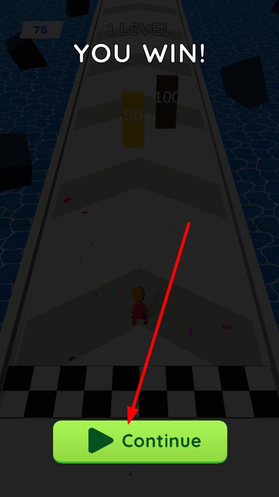 3、当成功抵达关卡终点时,显示YOU WIN的通关提示,并展示本关获得的分数与道具收集情况,点击Continue按钮后,将进入下一关。