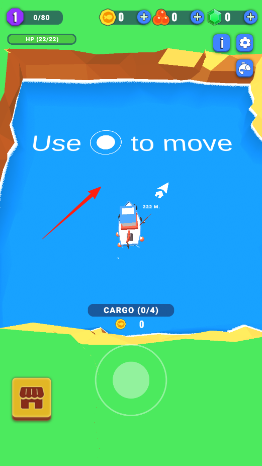 1、依据提示滑动虚拟摇杆,操控小船在水面移动,探索水域寻找鱼类,为捕鱼做准备,体验移动操控机制。