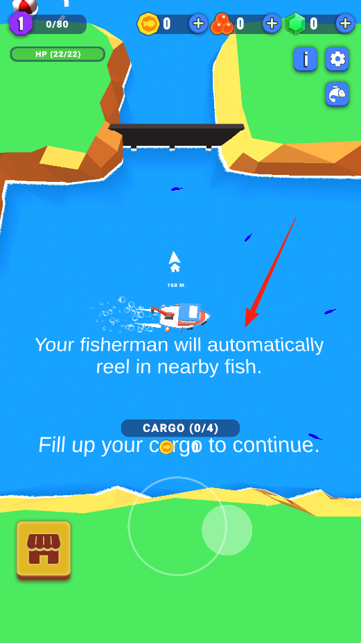 2、驾驶小船靠近鱼群,渔民自动收线捕鱼,积累货物,填满cargo后推进流程,体验自动捕鱼玩法。