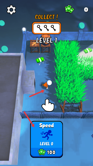 1、在Level1,操控角色移动,优先收集绿色钞票,积攒100元后升级Speed,提升效率。