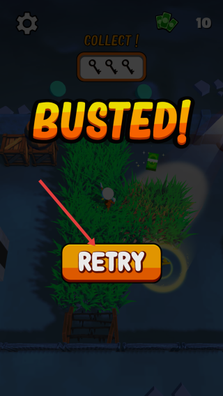3、若被发现显示BUSTED,点击RETRY重新挑战,调整策略,继续收集钥匙与钞票。