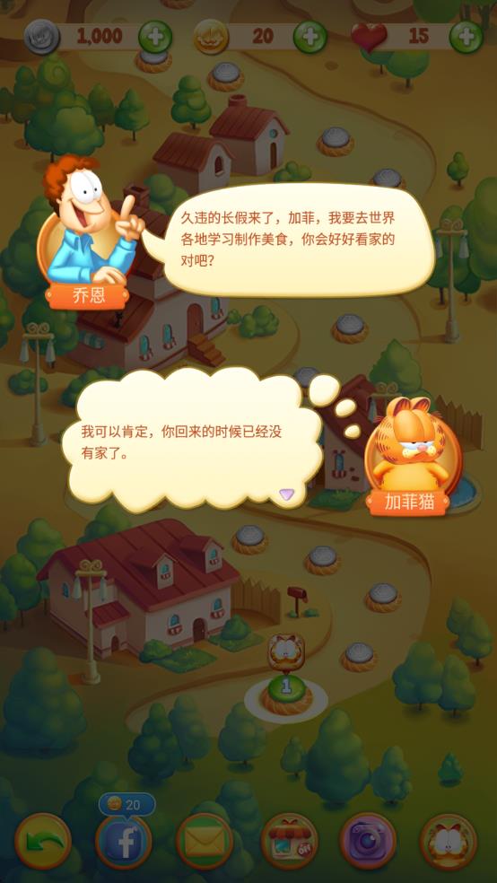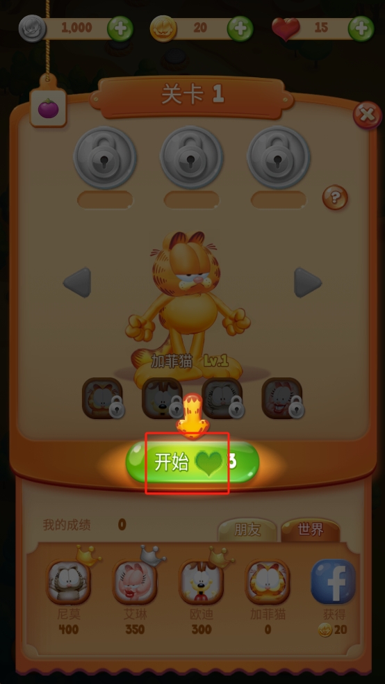 1、在关卡选择界面,点击绿色的开始按钮,消耗3颗爱心,进入关卡1,使用加菲猫角色开始游戏。