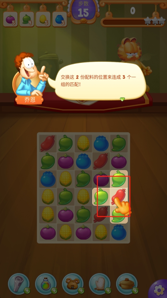 2、进入消除界面,按乔恩提示,交换指定绿色蔬菜与红色香肠位置,凑齐3个同组配料消除,完成任务。