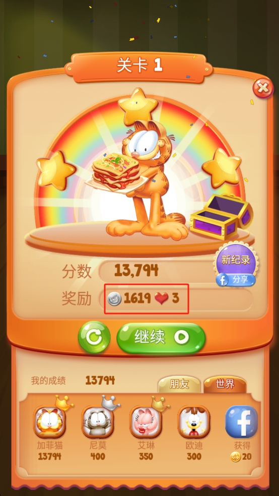 3、关卡通关后,屏幕会飘出食物香气特效,加菲猫会举着完成的菜品展示,界面上还会显示本局的评分与奖励。