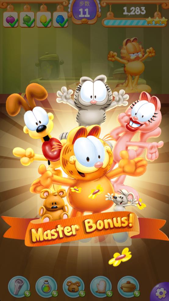 3、食谱收集解锁:每关对应一道加菲猫喜爱的菜品,通关后解锁食谱并记录烹饪步骤,收集一定数量食谱可解锁加菲猫的隐藏皮肤,增加收集乐趣。
