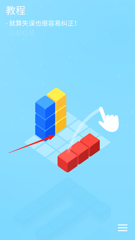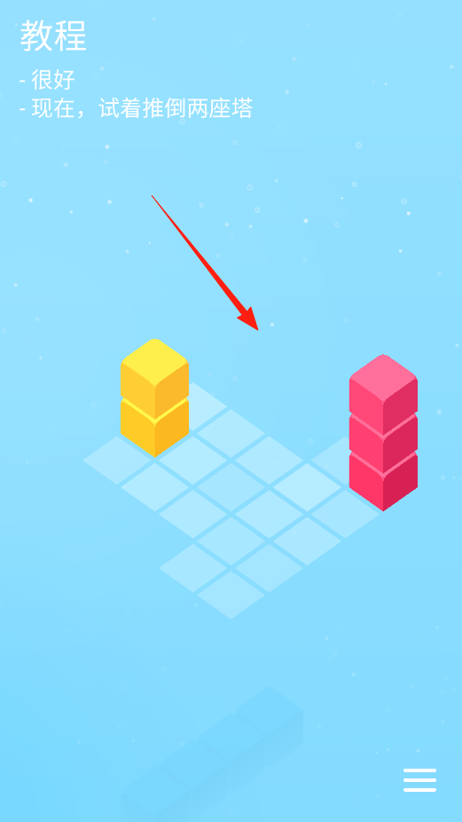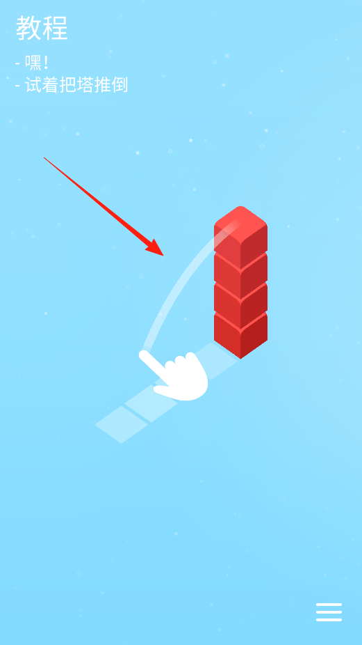 1、跟随教程指引,用手指滑动,向红色塔块施加推力,让它倾倒,熟悉操作方式开启推塔挑战,体验基础推塔机制。