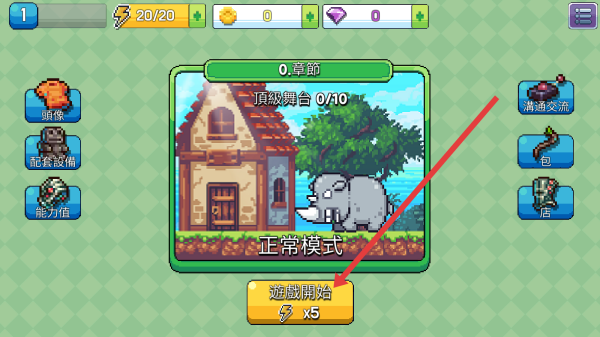 1、在游戏选关界面,确认0_草節-頂級舞台-0/10关卡,点击黄色遊戲開始-x5按钮,进入正常模式关卡。