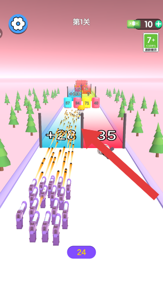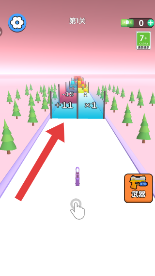 1、呈现界面第1关,根据提示进行移动选择增益较高的数字,玩家操控角色射击,通过关卡目标,利用增益提升战力。