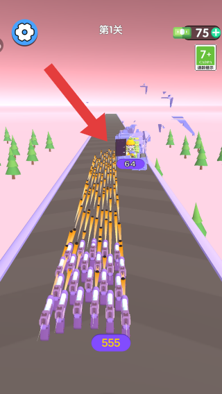 3、玩家操控大量紫色持枪角色前进,箭头所指方向是目标位置,玩法有简单的资源计数功能。