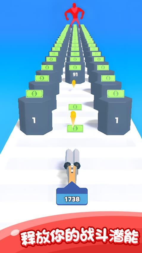 2、移动的过程中会遭遇不同的敌人,需要根据增益的数字来增加武器的数量,玩家操控队伍射击方块,借助增益提升战力推进关卡。