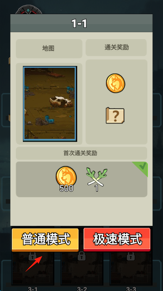1、选关卡1-1,点普通模式进入,目标拯救小动物共8只,首次通关奖500金币+道具。