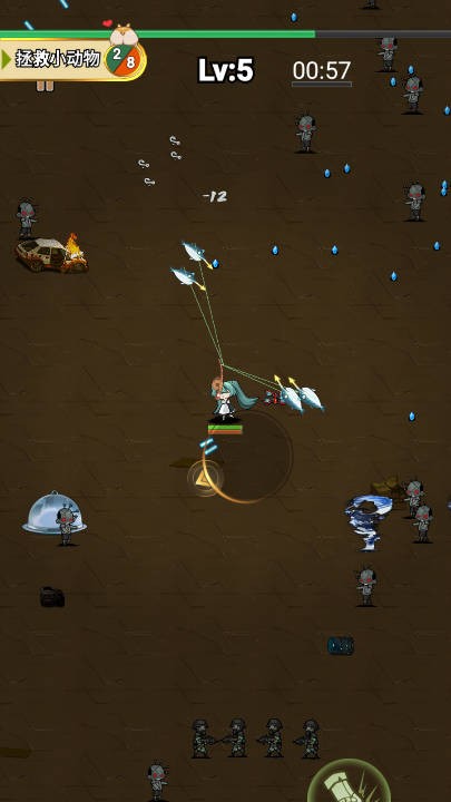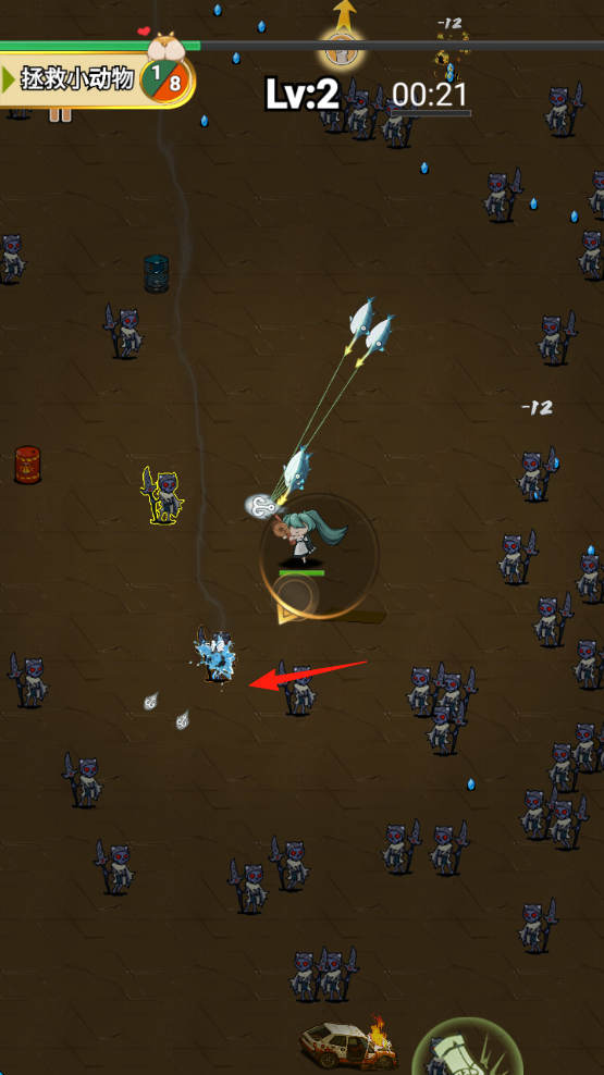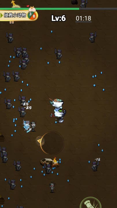 3、升级提升战力,拾取场景水滴蓝色等道具,存活到计时结束,完成拯救小动物任务,解锁新关卡。