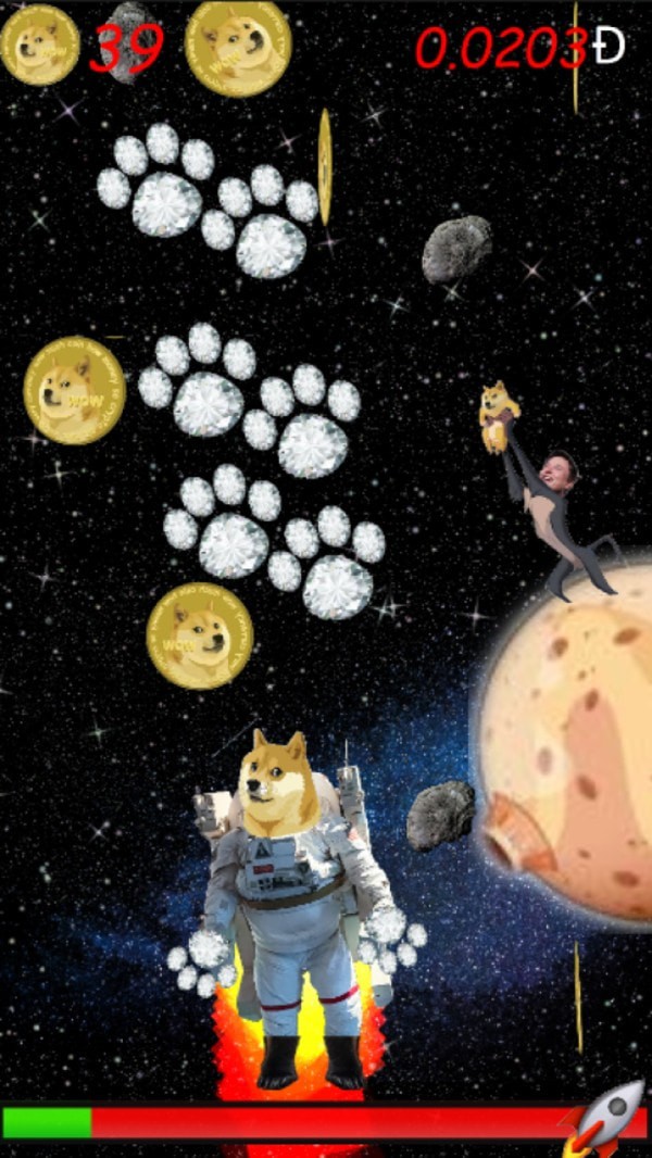 2、游戏中点击或滑动屏幕移动角色,接取漂浮狗狗币,避开陨石障碍,持续积累分数推进关卡进程。
