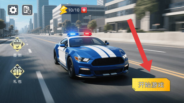 1、画面中有警车、城市道路场景,还有签到、礼包等功能按钮,点击开始游戏按钮可进入游戏流程。