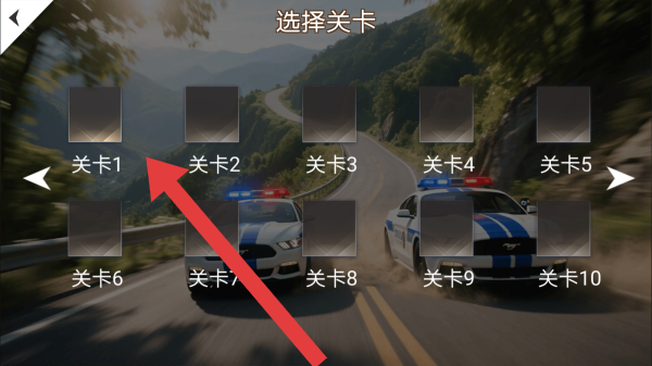 2、界面显示选择关卡,有关卡1-关卡10等选项,背景是公路上的警车,玩家驾驶警车完成各关卡任务的玩法。