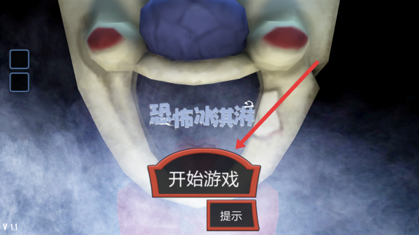 1、在恐怖冰淇淋游戏启动界面,根据红色箭头指向处,点击开始游戏按钮,进入充满挑战的游戏世界。
