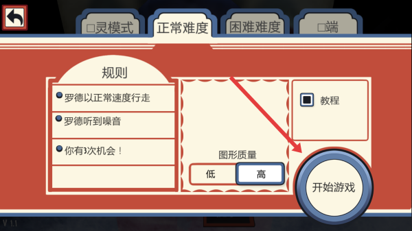 2、点击选择正常难度,确认图形质量为高,勾选教程选项后,点击开始游戏按钮正式开启冒险。