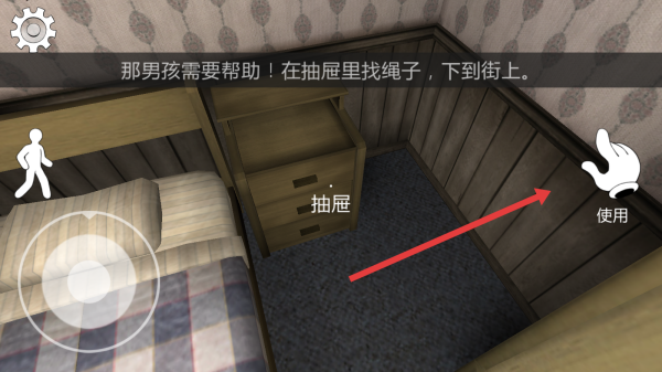 3、进入房间场景,根据提示前往抽屉处,可以点击使用交互,在抽屉里寻找绳子,推进救援男孩任务。