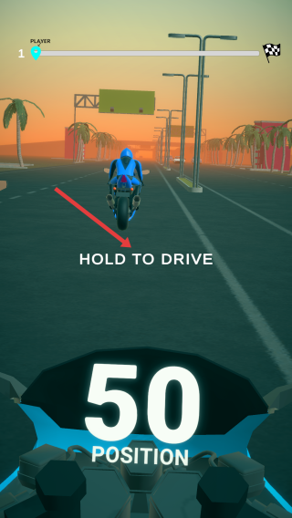 1、在摩托竞速游戏中,按住屏幕HOLD TO DRIVE,让角色驾驶摩托在公路启动,开始比赛。