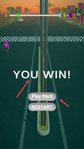 3、冲过终点线显示YOU WIN后,点击Play Next进入下一关,或选RESTART重玩本关。