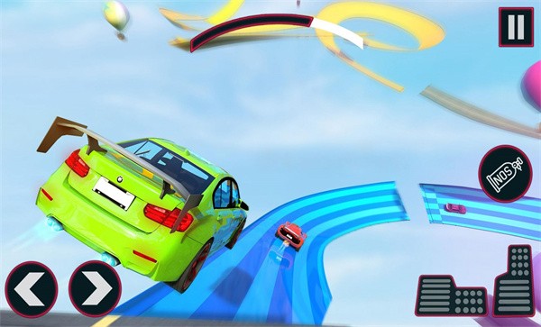 2、特技场景密集设计:赛道由大量大型坡道构成,包含危险急转弯与跳跃障碍等,密集的特技场景让每一段行驶都充满挑战,凸显赛车特技表演的核心。