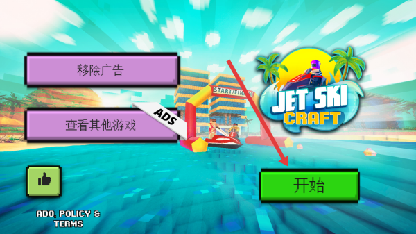 1、在JET-SKI-CRAFT游戏初始界面,根据箭头指示,点击绿色开始按钮,进入游戏游玩环节。