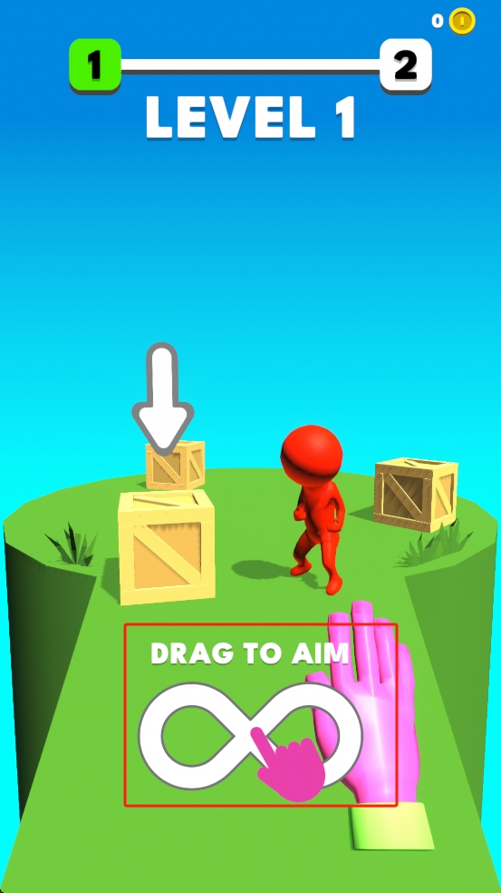 1、首先我们按住粉色手掌处的∞形按钮拖动,调整木箱投掷角度与力度,瞄准红色小人方向发射。