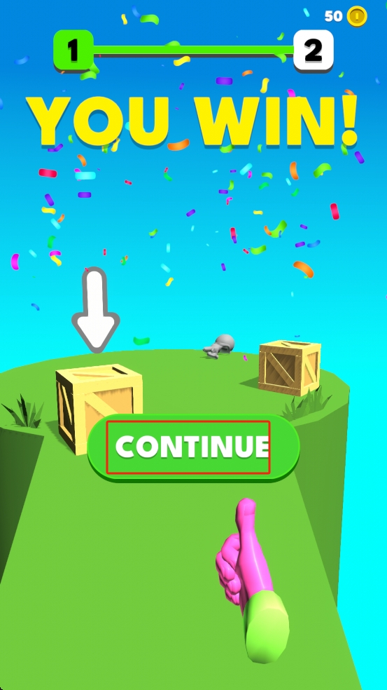 3、成功击败小人后,点击绿色CONTINUE按钮,进入下一关,挑战更复杂的投掷场景与目标位置。