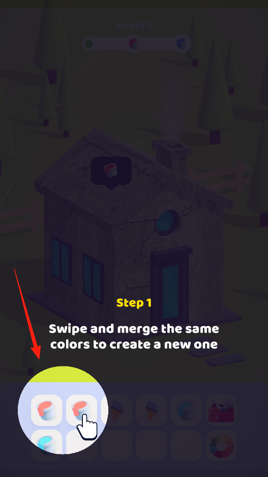 1、按照指引滑动合并同色颜料,将相同颜色的颜料块融合生成新颜色,为房屋上色做准备,体验色彩合成机制。