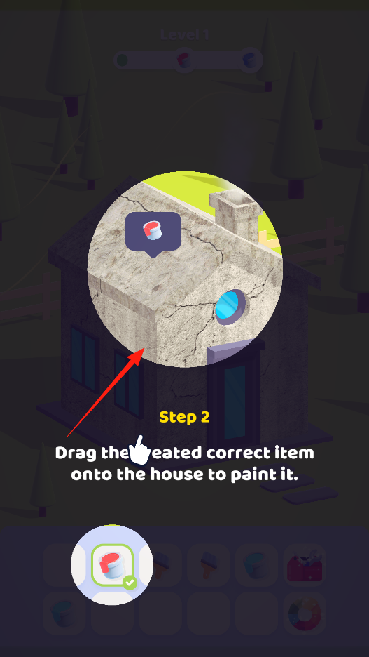 2、拖动合成的颜料,放置房屋破损处,精准对准位置为房屋粉刷,修复外观,推进关卡进度,体验物品应用玩法。